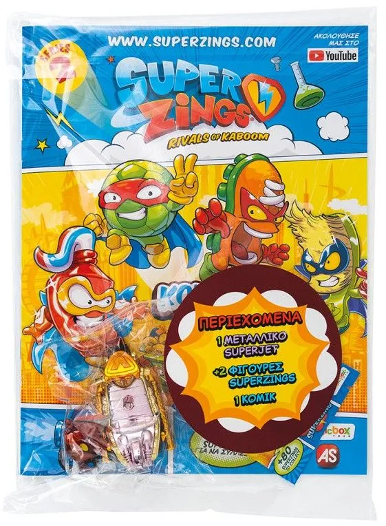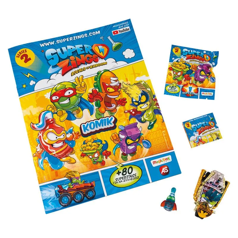 Superzings Σειρά 2 Rivals Of Kaboom Κόμικ Starter Pack Ήρθαν τα Superzings, αντικείμενα της καθημερινότητας που έχουν μοναδικές υπερδυνάμεις! Κάθε χαρακτήρας έχει τον αντίπαλό του, υπάρχουν σούπερ-ήρωες και σούπερ-κακοί! Συναγερμός!!! Ποιος κλέβει το μαγικό Kazoom; Είναι ο Enigma! Θέλει να καταστρέψει την Kaboom City; Τι ετοιμάζει ο Professor K; Μάθε…