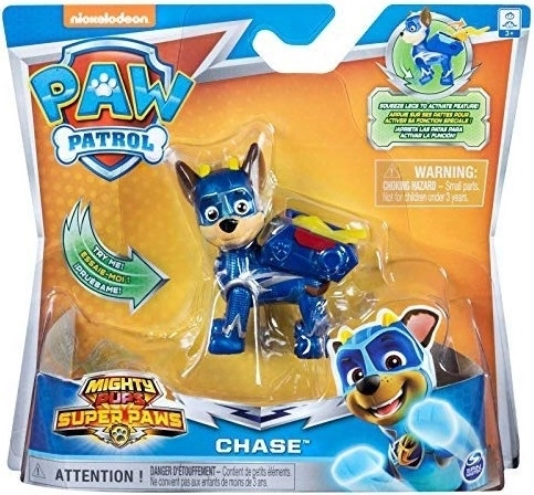 Paw Patrol Mighty Pups Super Paws Κουταβάκια Ήρωες Chase Θεματικά Κουταβάκια με μεταλλικές γυαλιστερές στολές,με ασημί λεπτομέρειες, μάσκα και ένα ημιδιαφανές φορτίο σε λειτουργία.Το φορτίο τους μπαίνει σε λειτουργία, μόλις τα πόδια ζουληχτούν.