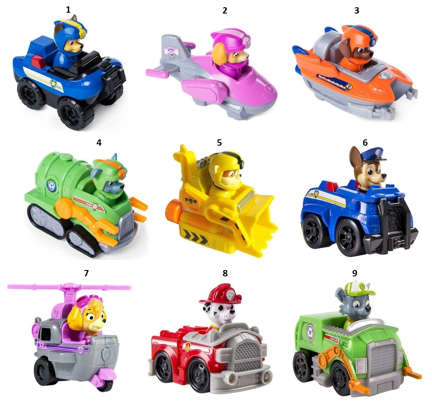 Paw Patrol οχήματα δράσης. Μια συλλογή μικρών οχημάτων με χαρακτήρα που δεν αφαιρείται. Η συλλογή αποτελείται από τα πιο διάσημα κουτάβια της τηλεοπτικής σειράς, Marshall, Chase, Zuma, Rocky, Skye και Rubble με διάφορα διακοσμητικά και είδη οχήματος.
