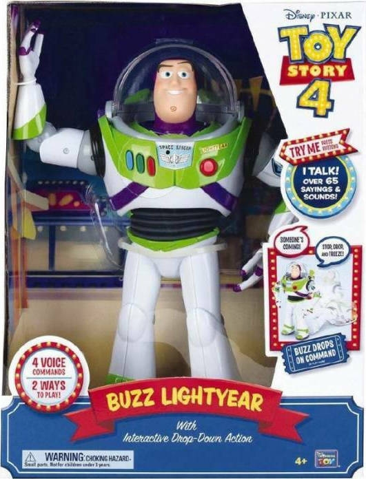 Όπως φαίνεται και στις ταινίες ο Buzz Lightyear πέφτει κάτω και μένει ακίνητος όταν τον πλησιάζουν άνθρωποι και τώρα μπορεί να απαντά φιλικά στις παιδικές εντολές.! Πες, “Someone’s coming!” ή “Quiet, go to sleep” και ο Buzz θα μείνει ακίνητος, θα πέσει κάτω και θα μπει στην σιωπηλή λειτουργία Toy Mode, όπως στις ταινίες! Θα σταματήσει να κινείται και θα αναπαράγει μόνο τις κλασσικές φράσεις παιχνιδιού όταν πατήσεις το φωνητικό κουμπί.. Πες, “Okay. No one’s here” και ο Buzz ζωντανεύει! Ο Buzz διαθέτει και έναν έξυπνο αισθητήρα. Γνωρίζει αν έχει πέσει κάτω και ζητάει την βοήθεια σου για να σηκωθεί όταν το πεδίο είναι ελεύθερο.To κεφάλι του Buzz κουνιέται ενώ μιλάει κατά την διάρκεια της διαδραστικής λειτουργίας LIVE MODE! Πες “Someone’s coming!” για να ενεργοποιήσεις το Drop-Down Action! Ο Buzz αναγνωρίζει την φράση και πέφτει κάτω αλλάζοντας σε λειτουργία TOY MODE, όπως ακριβώς και στην ταινία! Το κεφάλι του δεν κινείται πλέον! Πάτησε το μπλε κουμπί στο στήθος του Buzz και θα ακούσεις τις κλασσικές του φράσεις! Πες “Okay. No one’s here!” και ο Buzz ζωντανεύει κουνώντας ξανά το κεφάλι του! Αντιδρά στις εντολές σου! Πέφτει κάτω ακίνητος, αρκεί να του το ζητήσεις! Αντιδρά σε 4 διαφορετικές εντολές! 1. Hello Buddy! 2. Someone’s coming! 3. Quiet. Go to sleep. 4. Okay. No one’s here. Πάνω από 65 φράσεις! Εμφάνισε τα φτερά του Buzz τραβώντας τα προς τα έξω.Φτιάξε την συλλογή σου με τον Woody και τον Buzz για διπλάσια διασκέδαση!